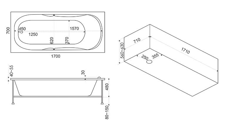 Ширина:700 ммВысота:630 ммГлубина:430 ммДлина:1700 ммЦвет:БелыйМатериал:Литьевой акрилОбъем:205 л