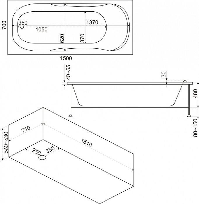 - Стандартные размеры, см:150x70