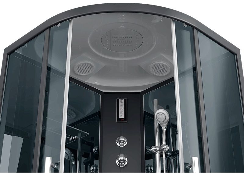 Центральная стойка черная, пластик"тропический душ, ручной душ 3х режимный, гидромассаж (кол-во форсунок 6 шт), верхний свет, сенсорный пульт, FM-радио, вентилятор, зеркало, полочка, рейлинг для душ-лейки.