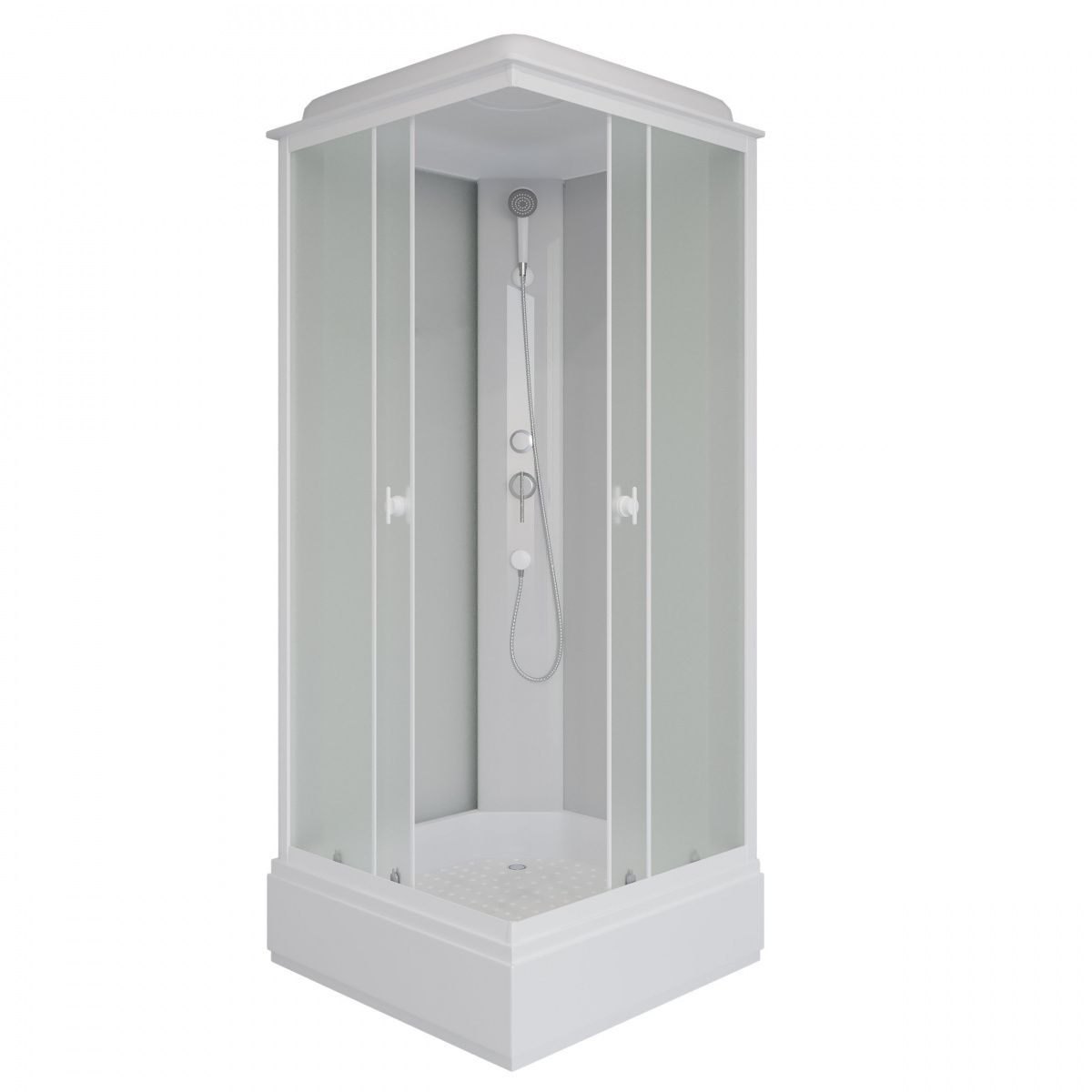 Размеры 100x100x215 смДушевая кабина, в простой комплектации серия Promo, основные функции тропический душ и ручная лейка. Поддон акриловый на железном каркасе, высота поддона от пола 30 см, внутренняя глубина чаши 13 см. Чаша поддона установлена на металлический каркас, с регулируемыми ножками. Нагрузка на поддон до 300 кгСтенки задние закаленное стекло 4 мм - белое матовое.Стенки передние закаленное стекло 4 мм - белое матовое.Смеситель латунь с керамическим картриджем (устойчивый к плохой воде - гарантия 10 лет)На крыше расположен тропический душ.Ручная лейка устанавливается на любую высоту (держатель в комплекте)
