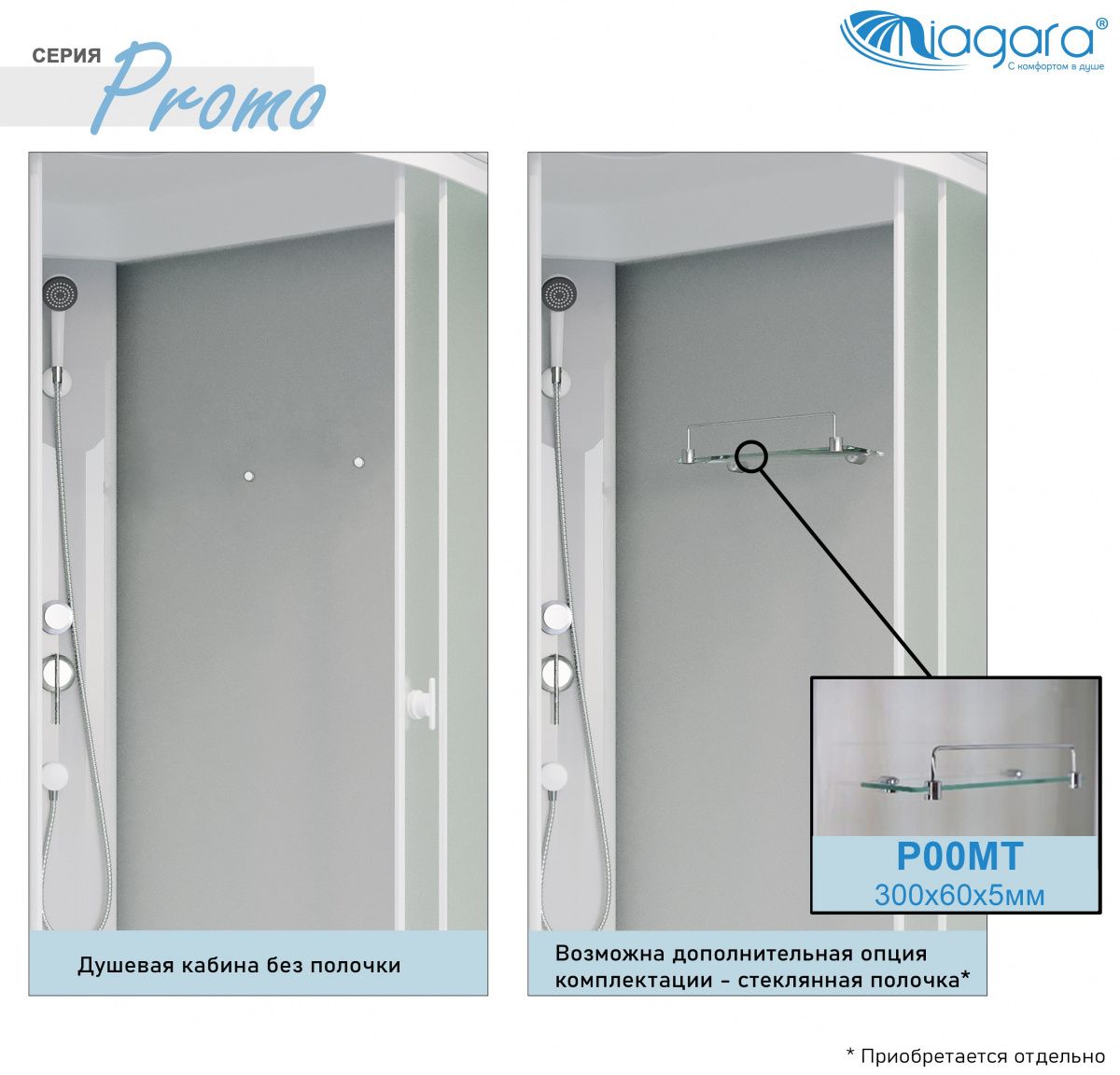 Душевая кабина Niagara Promo P120/80/26L/MT леваяБессиликоновая душевая кабина Niagara Promo P120/80/26L/MT ЛеваяРазмеры 120x80x215 смДушевая кабина, в простой комплектации серия Promo, основные функции тропический душ и ручная лейка. Поддон акриловый на железном каркасе, высота поддона от пола 26 см, внутренняя глубина чаши 13 см. Чаша поддона установлена на металлический каркас, с регулируемыми ножками. Нагрузка на поддон до 300 кгСтенки задние закаленное стекло 4 мм - белое матовое.Стенки передние закаленное стекло 4 мм - белое матовое.Смеситель латунь с керамическим картриджем (устойчивый к плохой воде - гарантия 10 лет)На крыше расположен тропический душ.Ручная лейка устанавливается на любую высоту (держатель в комплекте)