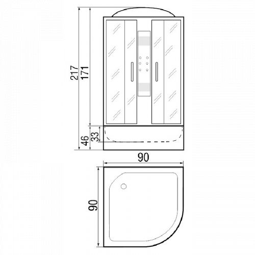 ~ крыша ~ верхний душ ~ вентиляц. отв-я(2шт) ~ центр.стойка ~ держатель д/лейки ~ ручной душ 3-х позиц. ~ полочка-3 шт. ~ смеситель с переключ. режимов ~ сиденье ~ поддон п/кр. выс.со/съем экр.(Н=46 см) ~ сифон