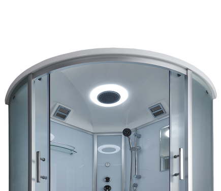 Внутреннее строение: Кабина оснащена верхним освещением, тропическим (верхним) душем, зеркалом и полками для удобства хранения и использования различных средств гигиены.