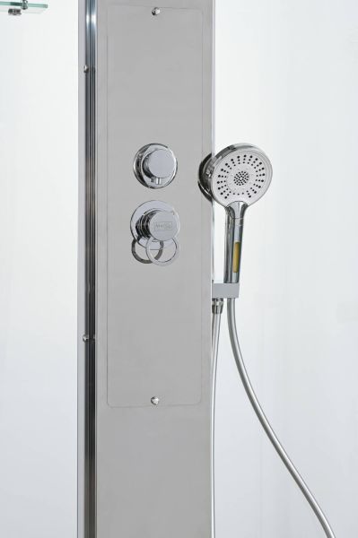 Стильная душевая кабина AvaCan сочетает в себе высокую функциональность, практичность и надежность. При изготовлении применяется безопасное закаленное стекло, надежно фиксируемое алюминиевым профилем. Профиль сделан из алюминия повышенной прочности. Сборка без силикона (увеличивает срок службы, защищает от протечек), внутренняя сборка (облегчает установку и ревизию; позволяет установить в ограниченном пространстве и обойтись без демонтажа других сантехнических приборов), смеситель резьбовой (без хомутов). Двойные металлические ролики дверей (распределение нагрузки на два ролика, увеличивают срок службы). Душевая штанга(позволяет регулировать по высоте ручную лейку), ручная арома-лейка с витамином С (картридж в комплекте,есть возможность замены или удаления картриджа), полочки(из стекла, с ограничителем), сифон с гидрозатвором.