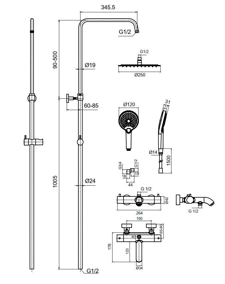 состоит из: верхний душ, ручной душ, термостатический смеситель для ванны, штанга для душа, держатель для душа; верхний душ 250 1jet из нержавеющей стали; размер душевого диска: 250 мм, тип струи: Rain; душевая лейка 120 мм, 3 режима струи, переключение Select; шарнирное соединение: регулируемый угол верхнего душа; длина держателя для душа: 345,5 мм; держатель для ручного душа регулируемый по высоте; поворотный держатель для душа; вид монтажа: внешний монтаж; соединительная резьба G ½; межосевое подключение 150 мм ± 12 мм; телескопическая штанга; подъемная труба может быть укорочена по высоте 90-550 мм; термостатический картридж Vernet; дивертер Citec; шланг 1500 мм с защитой от перекручивания; 2 года гарантии.