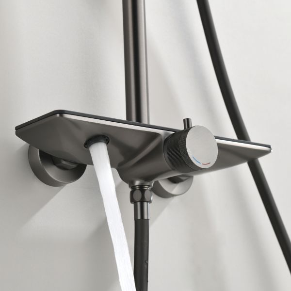 Душевая стойка от датского производителя Black&White в цвете оружейная сталь. Корпус штанги и смесителя производится из латуни марки HPB 59– безопасный для здоровья сплав, выдерживающий высокое давление воды. Для управления потоками и температурой установлен прогрессивный картридж без регулировки давления, для экономии воды, а также в данной серии переключатель режимов установлен сразу за картриджем в виде кольца c продольными насечками – нетривиальное решение, которое облегчает уборку. Верхняя крышка смесителя украшена тонированным стеклом . Из потребителей установлен верхний и ручной душ, а также излив для наполнения емкостей.