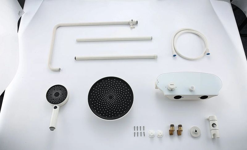 Душевая система со смесителем полкой Gappo G2495-88 в белом матовом цвете, регулировка воды поворотом ручки, включение/выключение нажатием кнопки, каскадный аэратор (водопад). Смеситель изготовлен из латуни, ручной душ с 3-мя режимами работы.