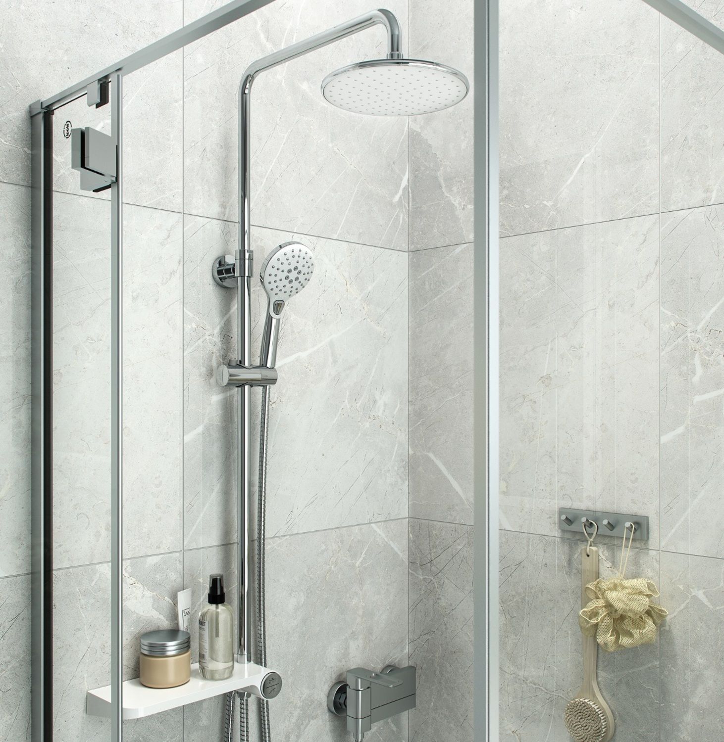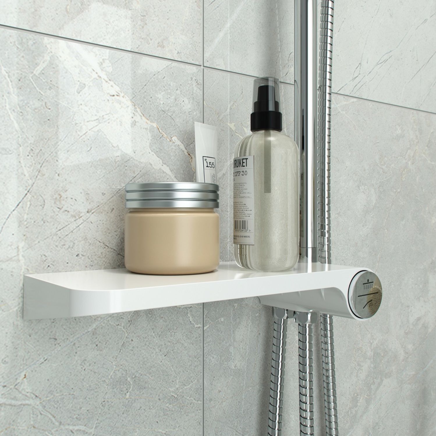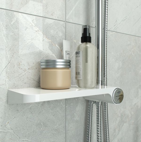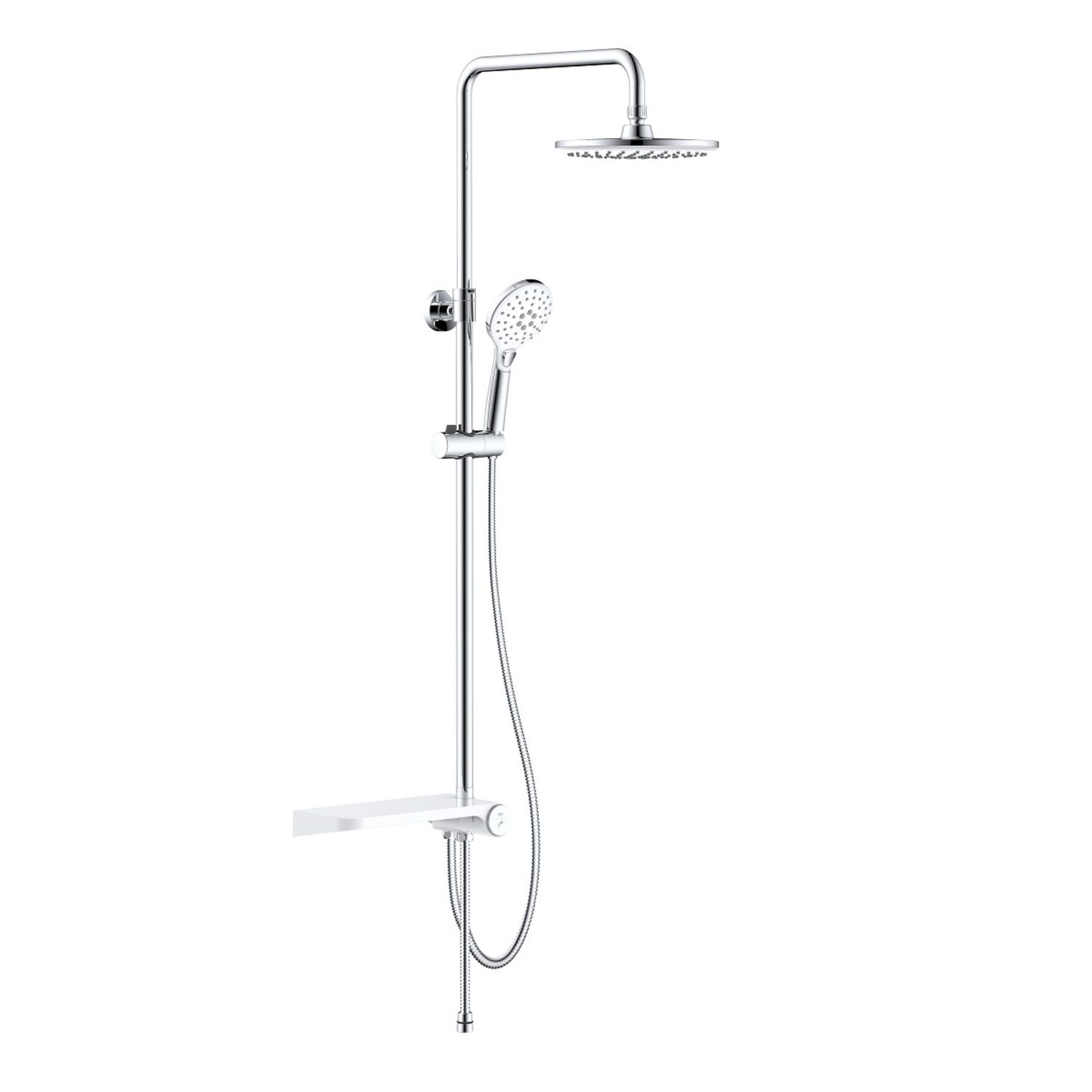 Душевой гарнитур с верхней лейкой. Белая полка и белые лейки. Стойка из нержавеющей стали диаметром 24 мм. Телескопическая стойка, высота 800-1100 мм. Ручная лейка с 3 режимами (Rain, Massage, Rain&Massage), кнопочное переключение режимов, цвет белый с хромом, диаметр 110 мм. Верхняя лейка белая с хромом, 1 режим, диаметр 220 мм, шарнирное крепление. Белая полка из ABS-пластика с кнопочным дивертором. Два шланга ПВХ в оплетке из нержавеющей стали: 1,5 м и 0,5 метра. В комплекте: крепеж.