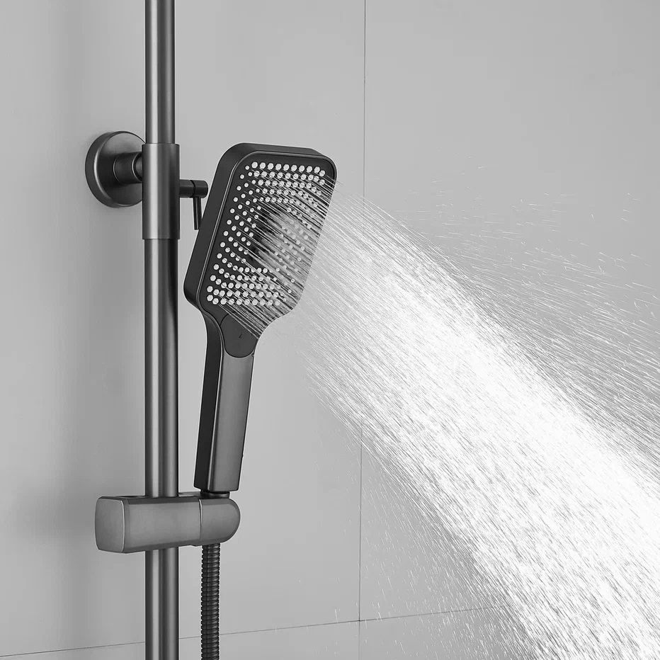 Душевая система Shevanik S9136T, оружейная сталь.Количество режимов струи: 3.Размер верхнего душа: 31x21,5 см.Управление: рычажное.Излив для наполнения ванны: да.