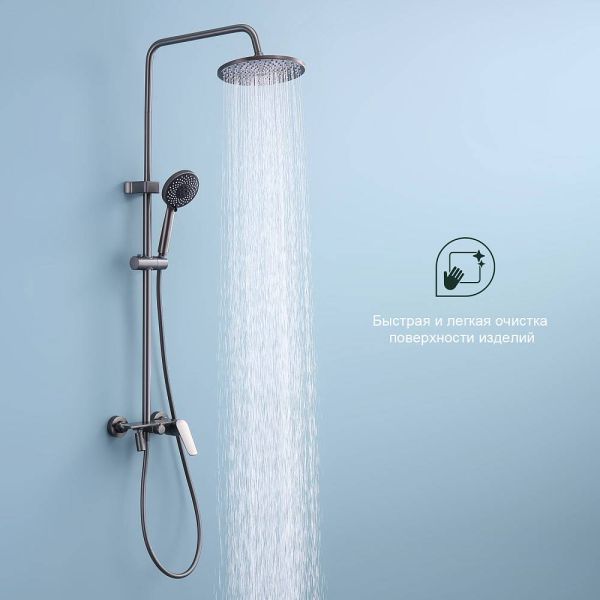 Душевая система Splenka S53.24.09, графит. Душевая система подходит для ванны и душа. Верхний душ имеет круглую форму размером 22 см. Ручная лейка у системы 3-х режимная. Лейки изготовлены из авс-пластика. Изделие выполнено в черном цвете, корпус латунный. Гарантия 5 лет.