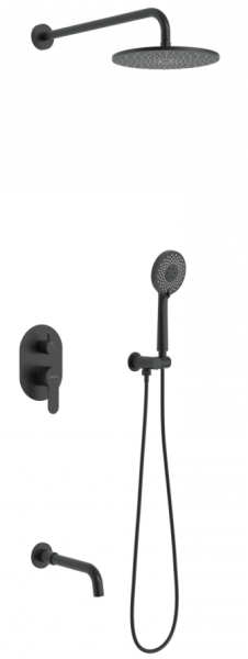 Душевой комплект BERGES NARDIS 3R BLACK - встраиваемый душевой комплект обладает трёхрежимной системой и состоит из верхней лейки - «тропического ливня», ручного душа, излива и смесителя. Лейка верхнего душа имеет инновационную систему самоочистки в виде гибких силиконовых вставок на форсунках душа, которые защищают изделие от известковых отложений. Изготовлены оба душа из ABS пластика. Комплект имеет матовое черное покрытие, которое выглядит безупречно на протяжении всего периода эксплуатации. Шланг выполнен из нержавеющей стали (внутри epdm), смеситель с латунным корпусом имеет керамический картридж с пропускной способностью 28 л/мин, все держатели и кронштейны сделаны из латуни и нержавеющей стали.Скрытый монтаж комплекта позволяет создавать красивое и эргономичное внутреннее пространство всего помещения.