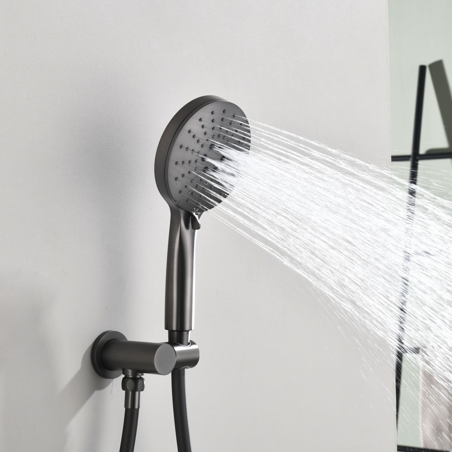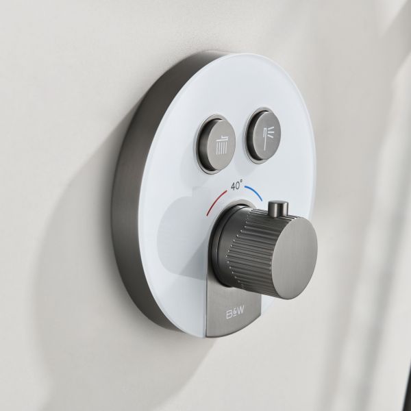 Комплект скрытого монтажа для душа датского производителя Black&White в цвете оружейная сталь. Корпус изделия выполнен в форме диска, в который интегрирован термостатический картридж прогрессивного типа для настройки температуры с постоянным давлением, а также кнопочный дивертор для выбора нужного потребителя. В комплектацию входит верхний душ на кронштейне цилиндрической формы и ручная лейка с режимами. Скрытая часть также входит в комплектацию данного изделия.