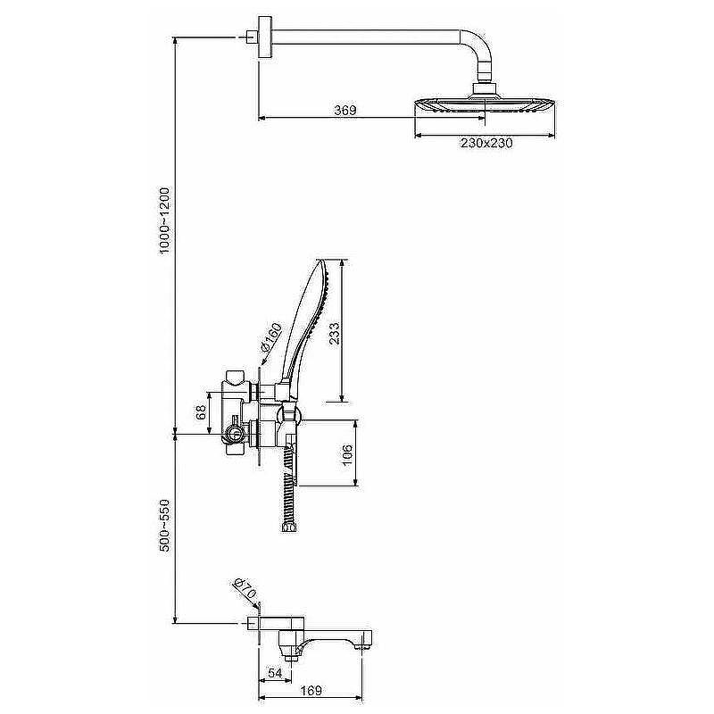 - излив для ванны длиной 169 мм (служит переключателем на лейку или верхний душ)