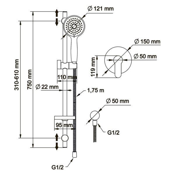 - ручной душ, с трёхрежимной лейкой;