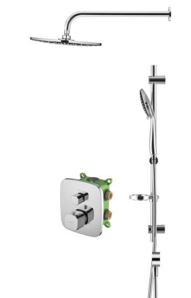 Душевой комплект со встраиваемым термостатическим смесителем на 2 выхода (в монтажном боксе), верхним душем ø300 мм и лейкой ø121 мм (3 режима). Цвет: хром, серый