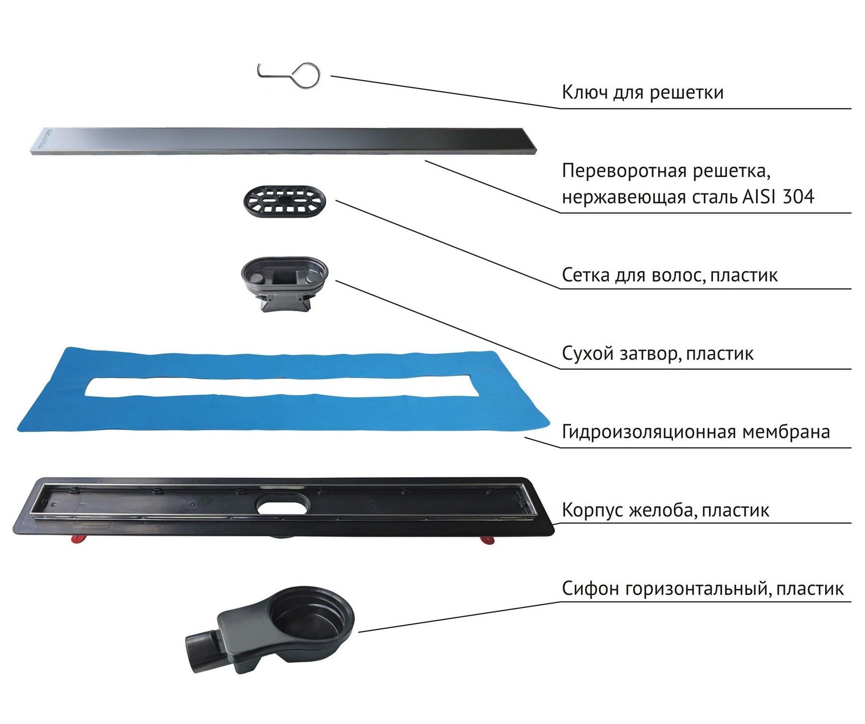 Корпус выполнен из особо прочного пластика, выдерживает нагрузку до 300 кг, устойчив к внешним химическим воздействиям, рабочая температура от -30°С до +75°С.Поворотная решетка шириной 48 мм, из нержавеющей стали AISI 304 толщиной 1 мм. Возможно использовать в двух вариантах: металл или плитка.Удобный и легкий монтаж за счет вращающегося на 360° сифона и регулируемых по высоте ножек. Минимальная монтажная высота 59 мм. Сифон с боковым выпуском D50, S-образной самопромывной конструкцией, высокой пропускной способностью 48 л/мин. Комбинированный затвор защитит от запаха из канализации.Простой уход за счет наличия сетки для волос и легкого доступа к сифону.Комплектация:• Корпус желоба из пластика• Двухсторонняя решетка из нержавеющей стали AISI 304• Комбинированный затвор• S-образный самопромывной сифон• Горизонтальный выпуск D50 H60, пропускная способность 48 л/мин, монтаж 360°• Регулируемые по высоте ножки• Самоклеящаяся гидроизоляционная мембрана• Сетка для волос• Ключ для решетки