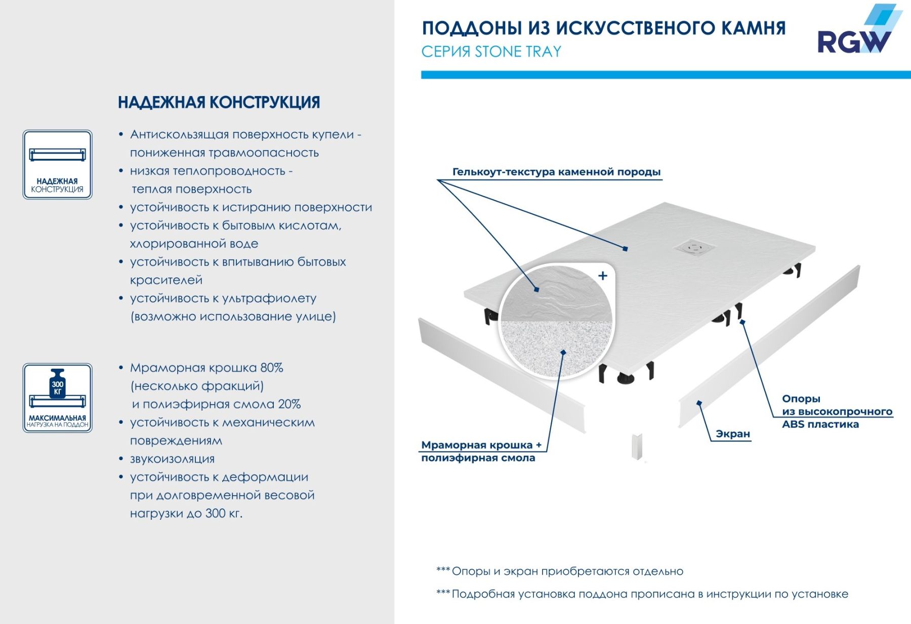Душевые поддоны RGW ST с фактурой под сланцевый каменьДля смелых любителей экстравагантных решений в интерьере!В серии душевых поддонов Stone Tray появилась новинка редкой полукруглой формы в сумасшедшем терракотовом цвете! Форма полукруга - идеальное решение для компактной ванной комнаты и позволит по максимум использовать полезное пространство, например, для мебели или бытовой техники.Изделие представлено в размере 900х900, при необходимости мы можем сделать резку по индивидуальному размеру.Визуальные акценты и форма - новые, а качество прежнее: рельефная антискользящая поверхность в сочетании с низкой теплопроводностью материала создает ощущение нагретого солнцем камня под вашими ступнями.Высокотехнологичный материал - 80% мраморной крошки плюс полиэфирные смолы - обеспечивает беспрецедентную устойчивость к механическим, химическим и другим видам повреждений, а также выдерживает долговременную весовую нагрузку до 300 кг.Приятное дополнение: низкий уровень шума воды, когда вы принимаете душ для ещё большего удовольствия.Новый поддон — это самостоятельный аксессуар вашей душевой. Самостоятельный и акцентный цвет и текстура “под камень” идеально сочетаются с интерьерами от смелых лофт и хайтек до романтичного прованса, а решетка из нержавеющей стали, защищающая слив, создаст безупречный аккомпанемент душевым системам, а таком же оттенке.Обратите внимание: фактические размеры с учетом заполнения швов могут меняться в пределах -8/+2 мм.По вашему желанию можем установить поддон на ножки:
