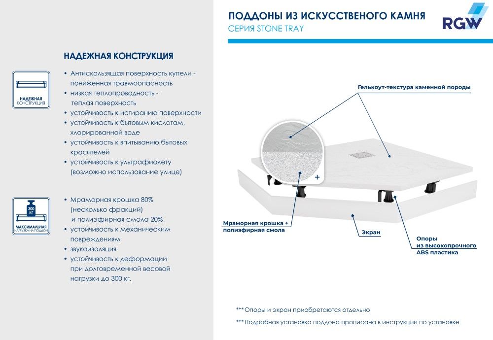 Душевые поддоны RGW ST с фактурой под сланцевый камень.Что вам известно о технологии «искусственный камень»?Это рельефная, но не ребристая поверхность, безопасная для всех членов семьи, в сочетании с низкой теплопроводностью материала для ощущения нагретого солнцем камня под вашими ступнями.Это высокотехнологичный материал - 80% мраморной крошки плюс полиэфирные смолы - обеспечивает беспрецедентную устойчивость к механическим, химическим и другим видам повреждений, делают уборкой легкой и и быстрой, а также выдерживает долговременную весовую нагрузку до 300 кг.В серии душевых поддонов Stone Tray появилась новинка уникальной трапециевидной формы в остро-модном цвете «графит».Форма трапеции - идеальное решение для компактной ванной комнаты и позволит по максимум использовать полезное пространство, например, для мебели или бытовой техники. Поддон представлен в двух размерах при необходимости материал позволяет обрезать изделие по индивидуальному размеру.Сдержанный темно-серый цвет впишет поддон в любой интерьер, сделав особый комплимент стилям лофт и хайтек, и позволит реализовать самые яркие идеи в остальном декоре ванной комнаты.Обратите внимание: фактические размеры с учетом заполнения швов могут меняться в пределах -8/+2 мм.По вашему желанию можем установить поддон на ножки: