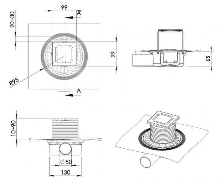 Решетка толщина 3мм, нержавеющая сталь AISI 304Горловина трапа и эксцентрик, пластикМонтажная заглушка, PPСифон PP с гидроизоляцией: горизонтальный выпуск D50 H65, монтаж 360°Комбинированный затворФланец с 3 сторон загибается на 90°Монтажный ключ, пластик