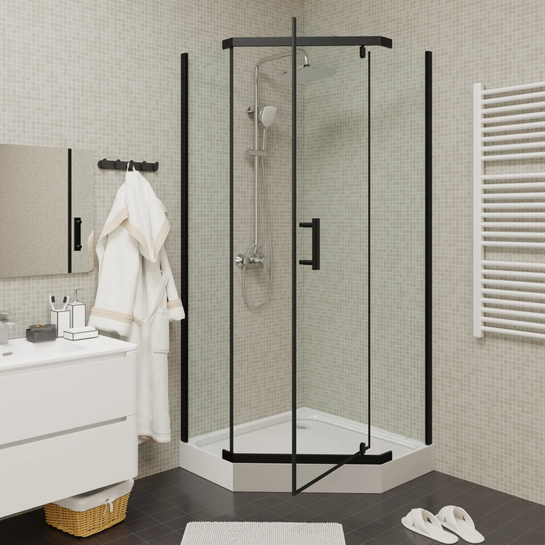 Каркас изготовлен из прочного закаленного стекла, что обеспечивает надёжность и долговечность конструкции. Поддон выполнен из высокопрочного ABS-пластика и имеет оптимальную высоту — 15 см. Это делает использование уголка удобным как для взрослых, так и для детей.