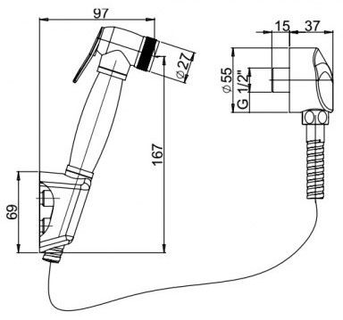 Гигиенический душ Aria - современное техническое решение для организации санузла. Комплект включает: держатель для душа, гибкий шланг 100 см, лейку гигиенического душа из латуни (лейка разборная для удобства очистки от известкового налета), настенный латунный вывод для воды.