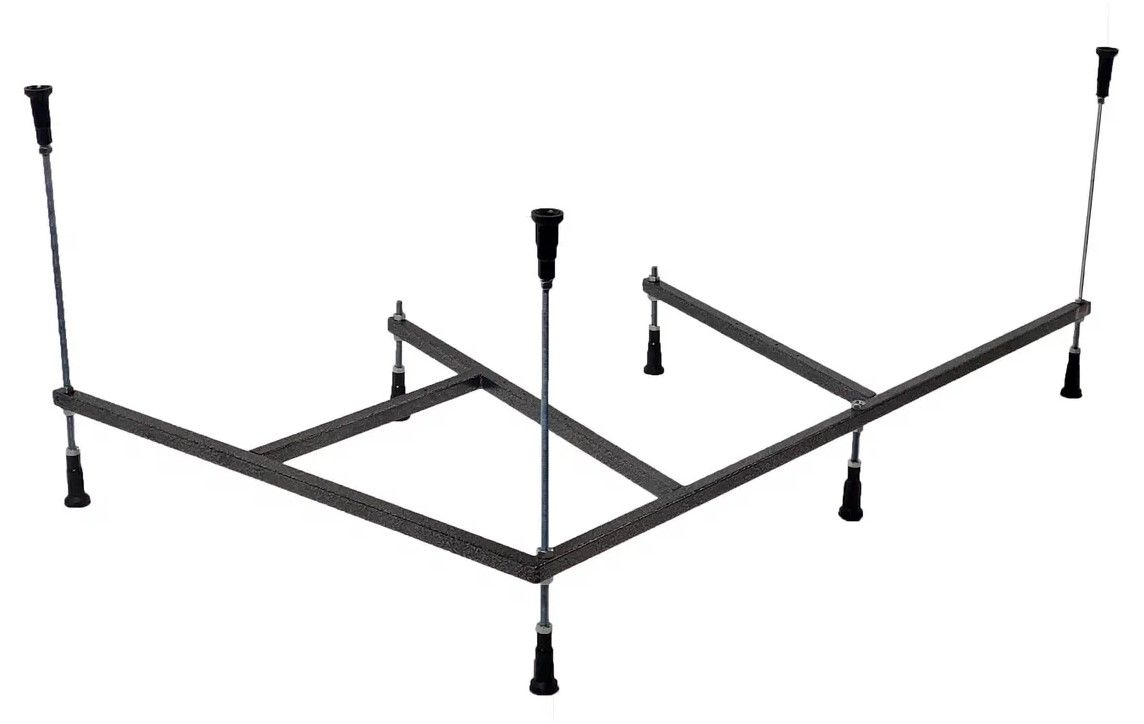 Усиленный цельносварной стальной каркас для ванны изготовлен из квадратного металлического профиля 2х2 см и окрашен темно-бронзовой молотковой краской. Каркас имеет 8 ножек и 4 опоры в борт ванны снизу. Предназначен для использования во влажных помещениях.