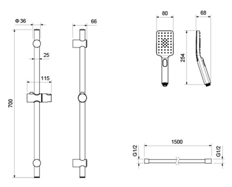 • Душевой гарнитур: душевая стойка, лейка, шланг