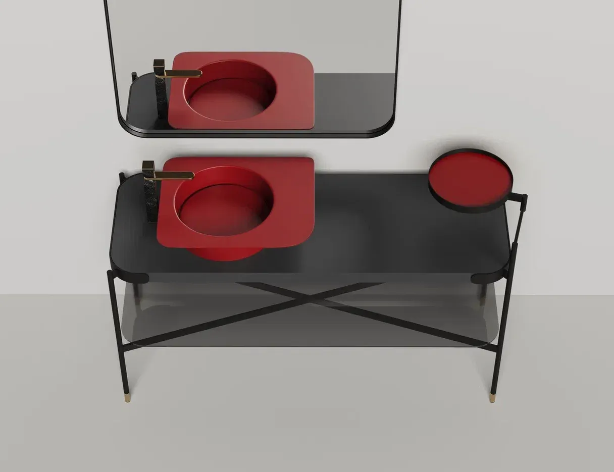 Каркас из чёрного металла с отделкой из латуни дополнен столешницей из материала S-Stone и полкой из рифлёного стекла, напоминающего поверхность водной глади. Зеркало в скоординированном дизайне создаёт законченный образ.