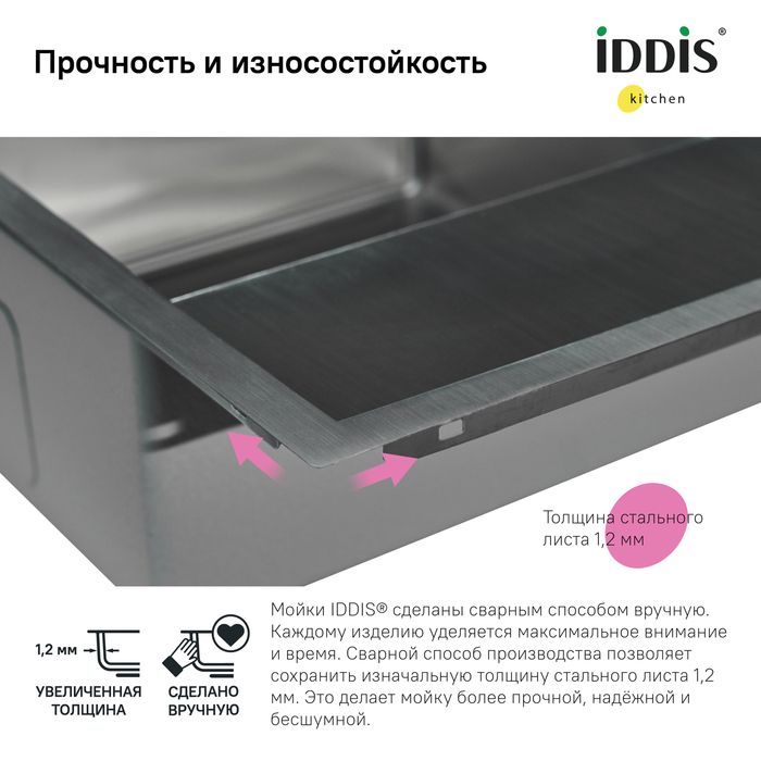 Изготовлена из нержавеющей стали, которая не боится бытовой химии и царапин. Ручная обработка позволяет сохранить изначальную толщину стали (1,2 мм) на всех элементах мойки, что обеспечивает ее надежность, ударопрочность и износостойкость.