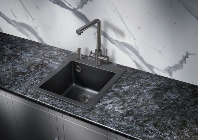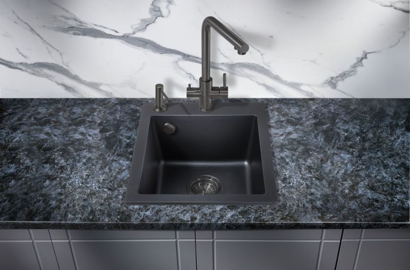 Кухонные мойки MILACIO — эталон стиля и качества даже для самых искушенных ценителей дизайнерской сантехники.Каменная врезная прямоугольная мойка для кухни MILACIO Murcia 42 Cuarzo (MC.77041), выполненная в черном матовом цвете, воплотила в себе лучшие особенности: безупречный вид, лаконичный дизайн, прочность конструкции и комфортное использование. Раковина изготовлена из высококлассного кварцевого композита — смеси частиц кварца и полиэфирных смол — красивого и современного материала, обладающего уникальной прочностью. Искусственный камень устойчив к любым воздействиям — царапинам, ударам, высоким и низким температурам (не боится кипятка и горячей посуды), бытовой химии, пищевым красителям, свету и загрязнению. Даже спустя годы изделие не потеряет цвет и форму и будет должным образом выполнять свои функции. Кухонная кварцевая мойка достаточно компактна, чтобы лучшим образом использовать пространство в небольшой комнате. Размер компенсируется глубокой чашей квадратной формы — в нее поместятся сразу несколько комплектов посуды. Благодаря правильной геометрии мойки капли не разбрызгиваются в стороны, а специальное водоотталкивающее покрытие не дает воде растекаться по поверхности, что сводит загрязнение к минимуму.При этом уход за раковиной достаточно прост: пятна легко убираются чистящими средствами — без подтеков и разводов.