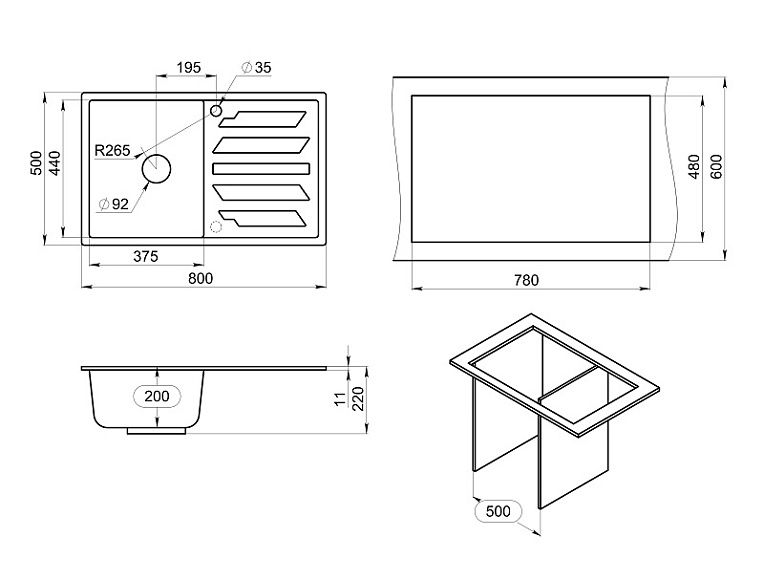 - Отверстия под смеситель:1