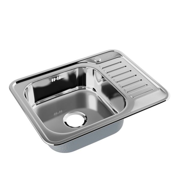 Стальная мойка Basic с блестящей полированной поверхностью размером 65х50 см и крылом, на котором удобно сушить вымытую посуду, овощи или фрукты. Чаша глубиной 17 см расположена слева.