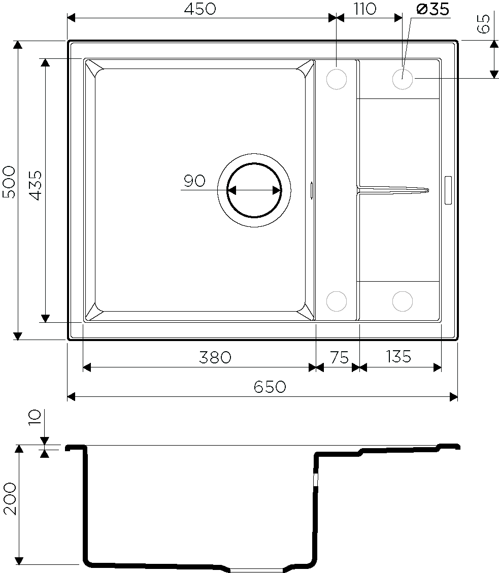 - Отверстия под смеситель:нет