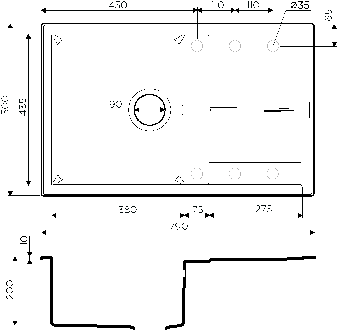 - Отверстия под смеситель:нет