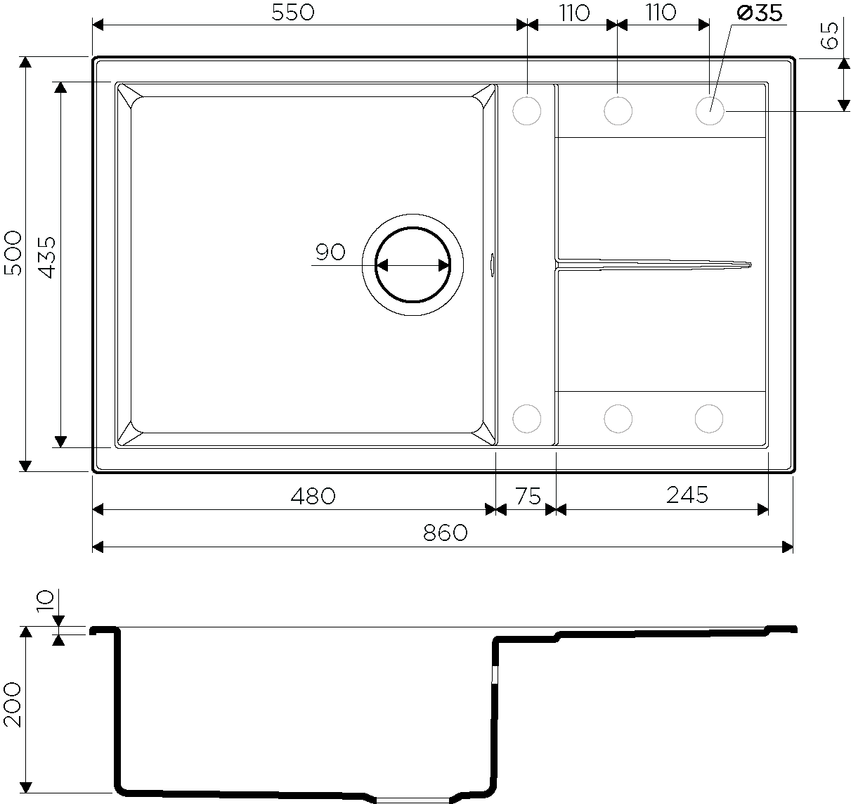 - Отверстия под смеситель:нет