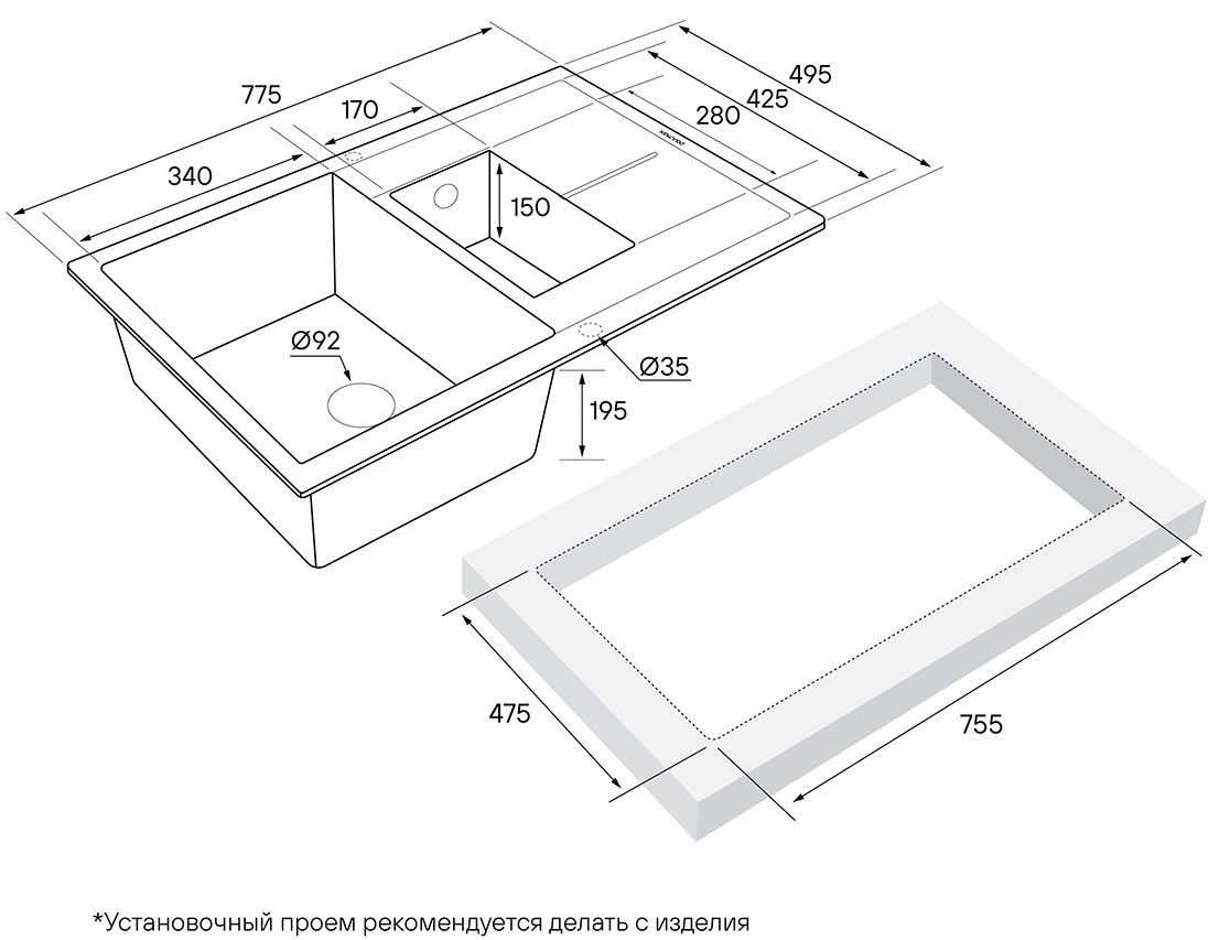 Материал мойки устойчив к механическим повреждениям, а также выдерживает температуру до 180 градусов.Просторная площадка под смеситель
