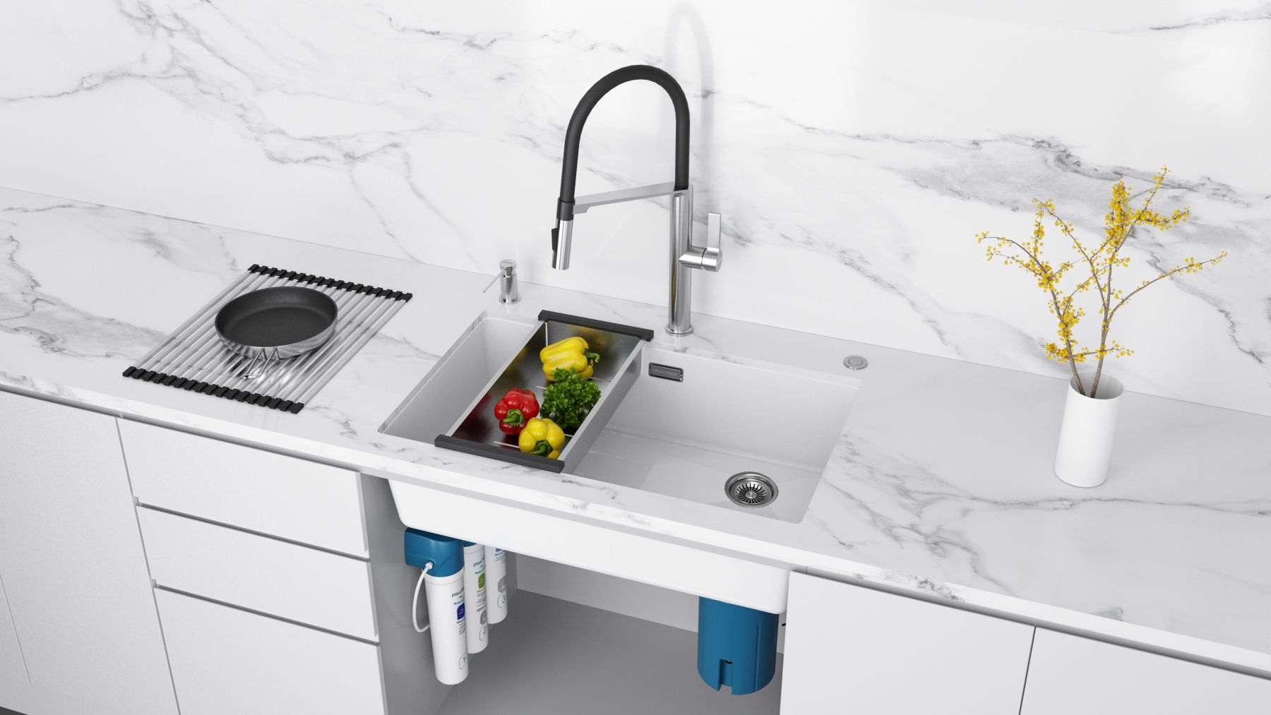 Находится в углу, благодаря чему увеличивает рабочее пространство под мойкой.Практичная эстетика