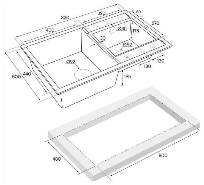 - Отверстия под смеситель:нет