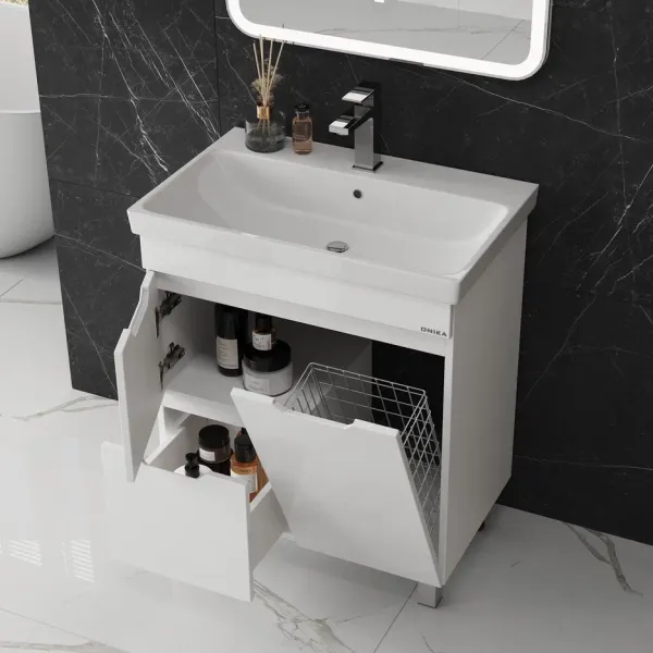 Напольная тумба для ванной комнаты Onika Айленд 70 сочетает в себе стильный минималистичный дизайн, белую глянцевую поверхность и высочайшее качество исполнения.