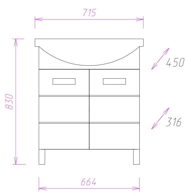 Размеры тумбы без учета раковины и ножек: 66x31x68 см.