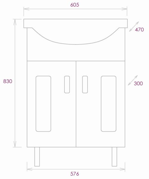 Размеры тумбы без учета раковины и ножек: 58x30x68 см.