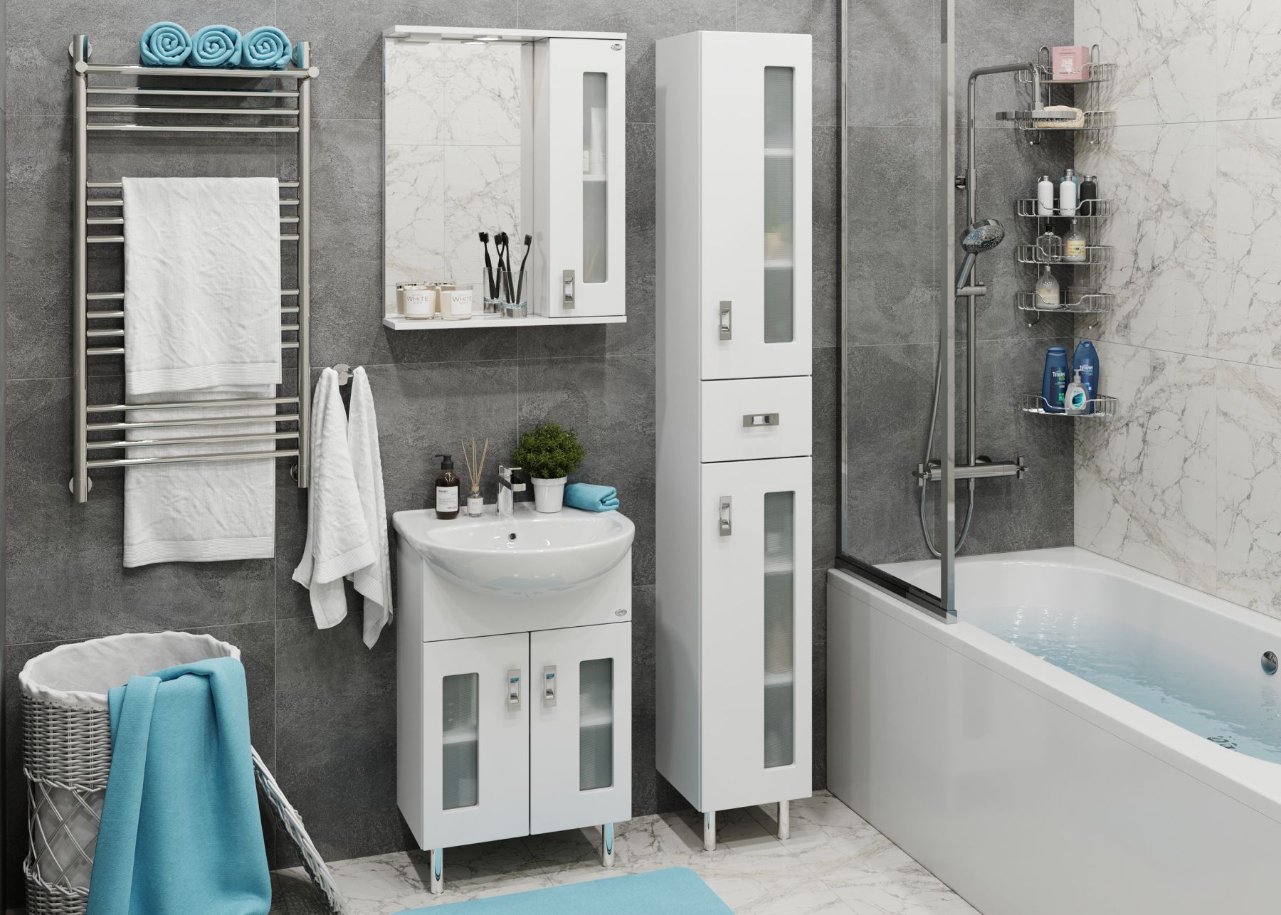 Глянцевый белый цвет фасада в сочетании со вставками из матового стекла придадут ванной комнате ощущение свежести, чистоты и уюта.