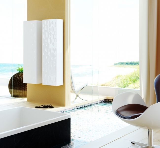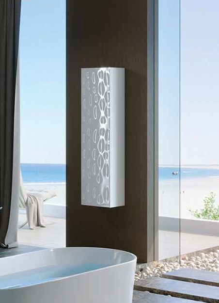 Подвесной шкаф пенал Clarberg Dune 35 DUN0535 с одной распашной дверцей и четырьмя стеклянными полками. Природные мотивы: узор песчаных дюн балтийского побережья. Для использования в ванных комнатах с повышенной влажностью.Технические данные:Цвет: белый.