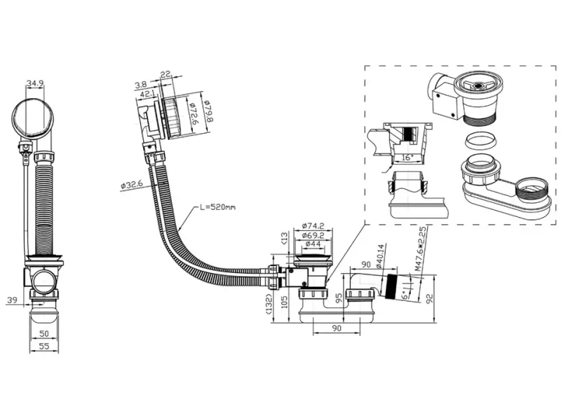 Перелив п/а с сифоном плоский 600мм (металл) CK60PF