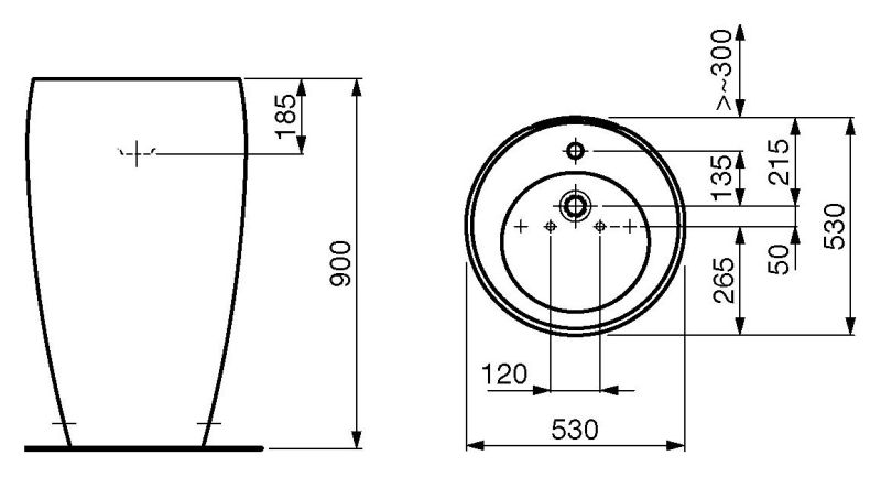 Объединенная с пьедесталом с системой CLOU 520 х 530 мм. С одним отверстием для смесителя по центру.