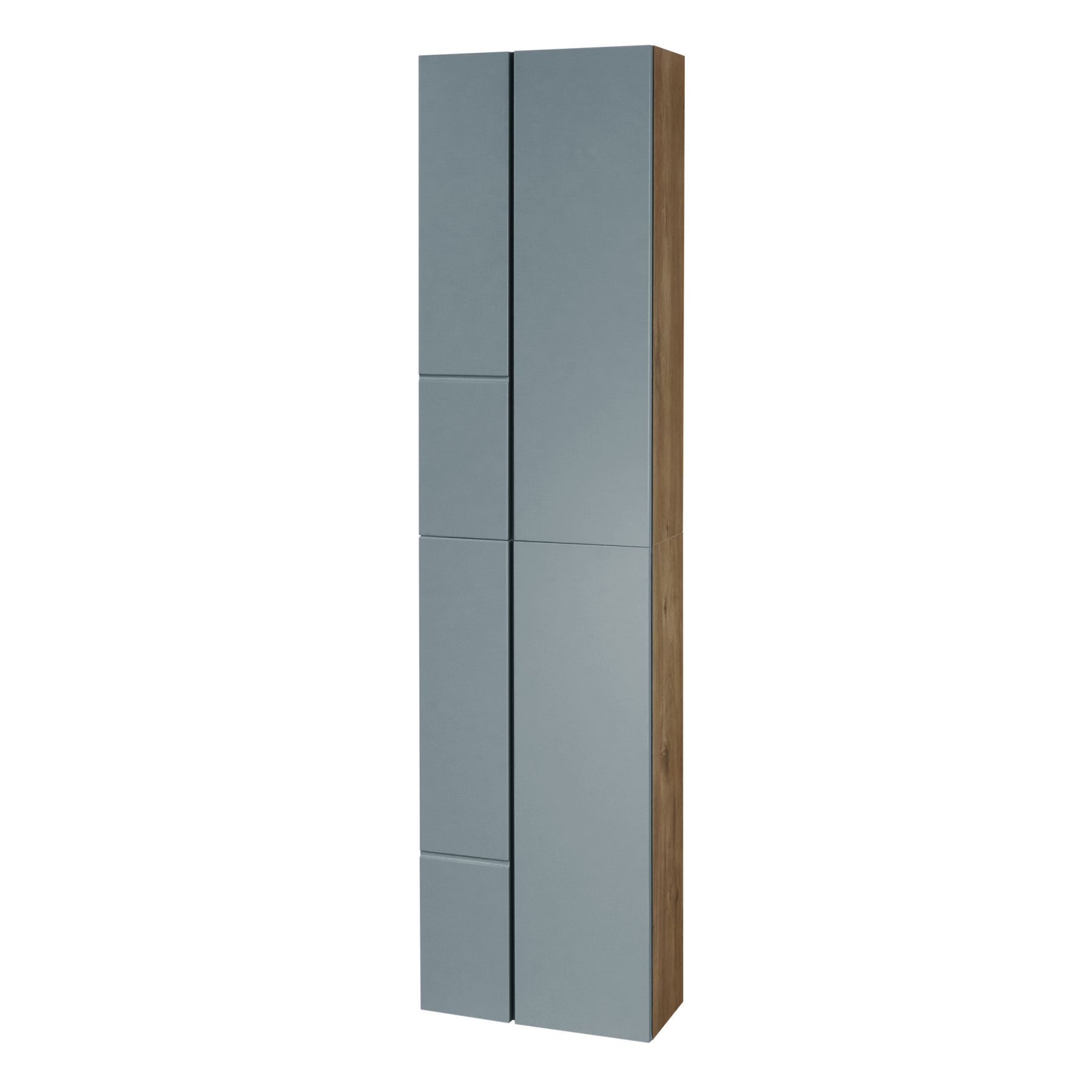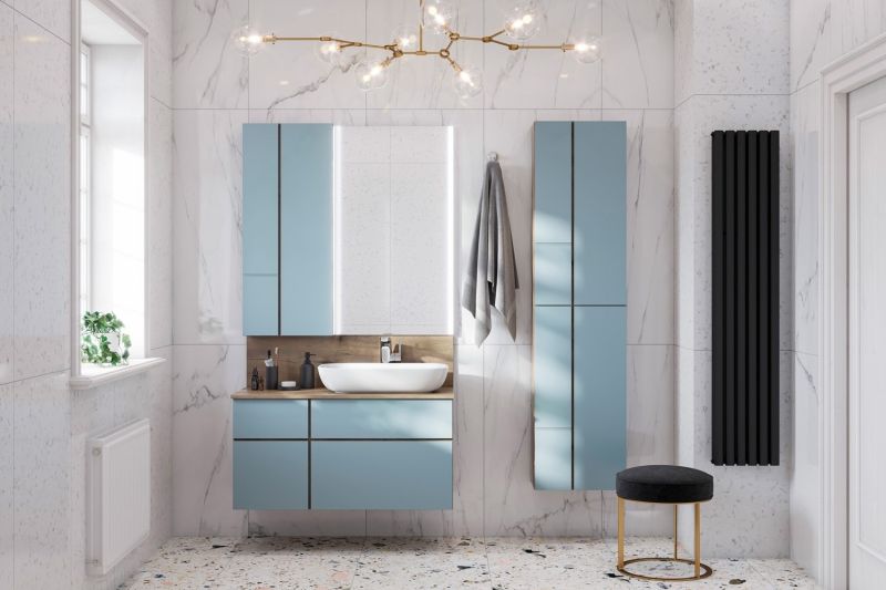 - Дизайн шкафчика повторяет тумбу-умывальник: фасады в матовой пленке фьерд сочетаются с корпусом в декоре дуб рустикальный