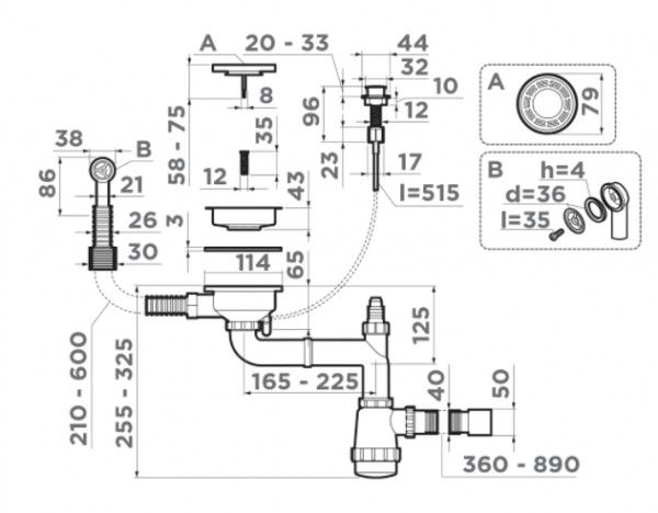 Арматура для одночашевых моек с прямоугольным переливом, декоративной решеткой и клапаном-автомат. Подходит для моек из серий TAKI, AKISAME, OMI, TADZAVA И KATA.