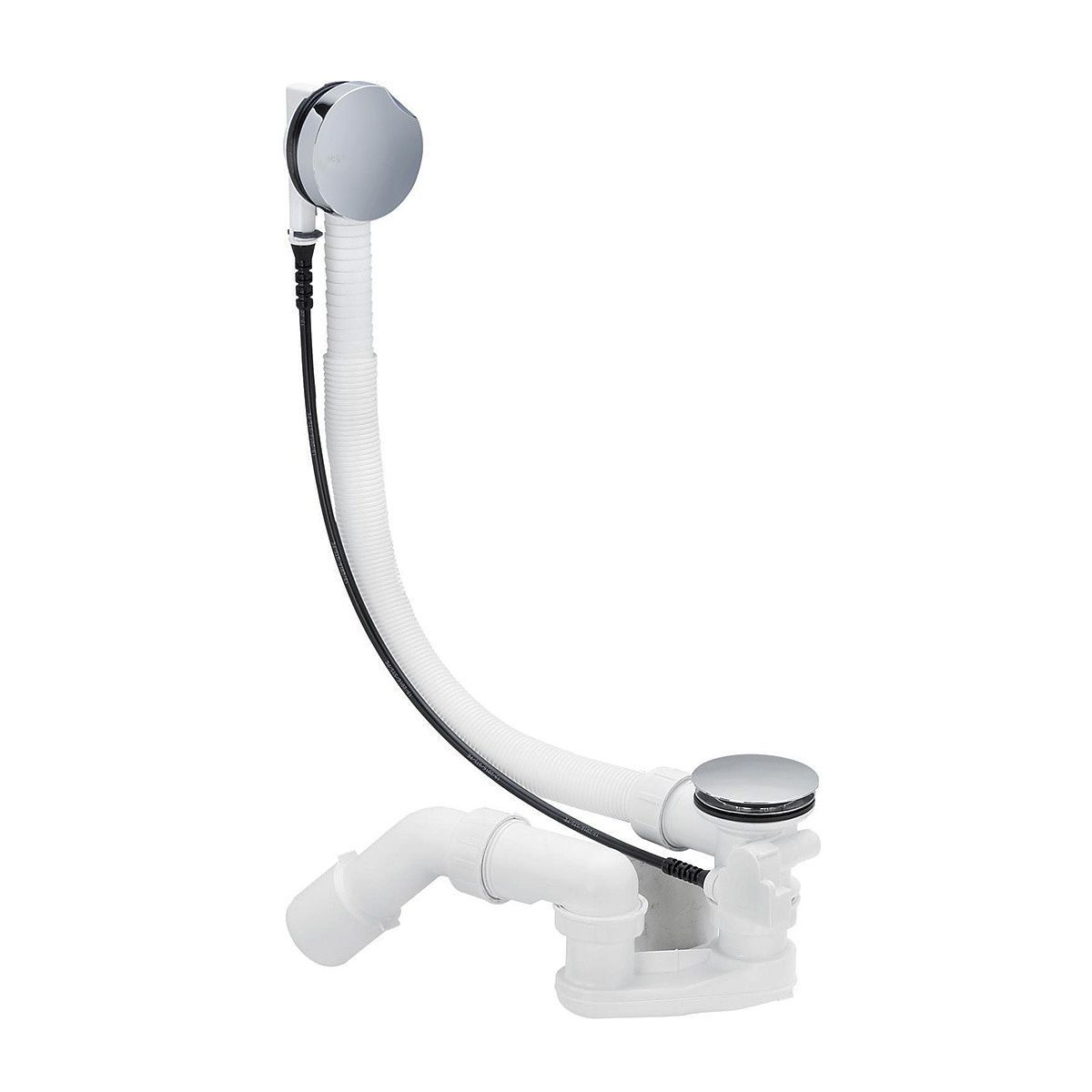 гибкая переливная труба, хромированная поворотная накладка переливного отверстия (верхняя), хромированная пробка донного клапана со штоком, гидрозатвор, отводящее колено 45°, донный клапан - нержавеющая сталь.