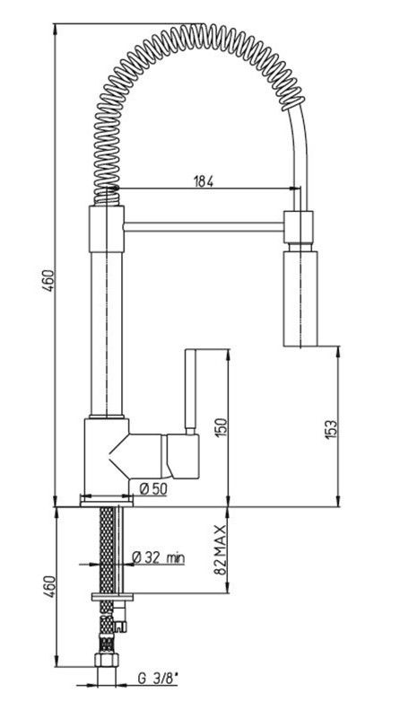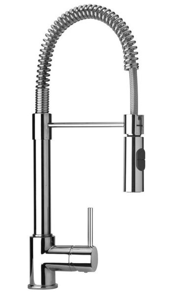 - Высокий корпус, лейка с двумя режимами подачи воды, пружина вокруг шланга, придающая устойчивости изливу.