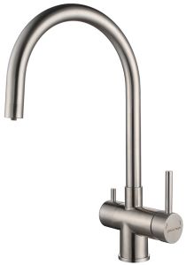 Смеситель для кухни, с возможностью подключения фильтра питьевой воды, артикул He213218-SSИзготовлен из нержавеющей стали AISI 304. Нержавеющая сталь AISI 304 легирована никелем, марганцем, медью и хромом, что обеспечивает ей повышенную прочность и устойчивость в коррозионных средах, такая сталь подвержена деформациям.